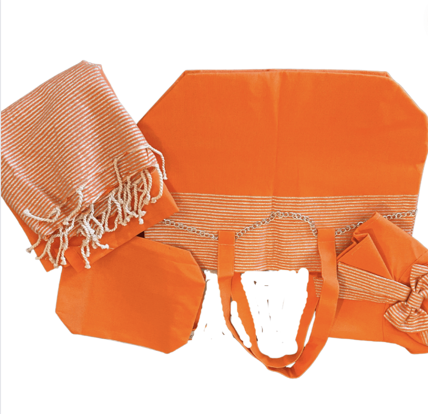 Ensemble de plage 4 pieces(pochette, chapeau, serviette et trus)